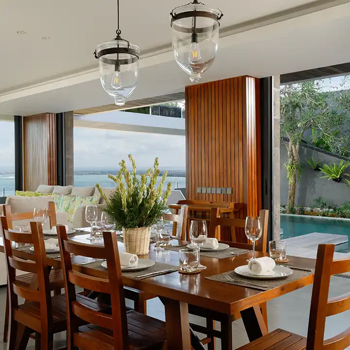 Nestled along the cliffs of Jimbaran, Santos Cliff View offers an exquisite escape with breathtaking sea views. This luxurious villa spans three floors, seamlessly blending indoor and outdoor living spaces. An open dining area and an outdoor live kitchen set the stage for unforgettable meals with the ocean as your backdrop.
